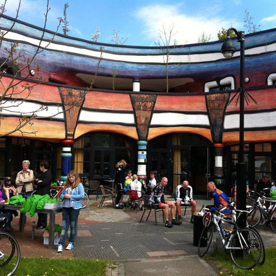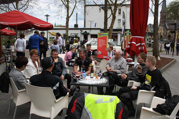 Amstel Gold Race. Een lang gemeleerd peloton fietste via het uitdagende AGR parcours naar de pauze plaats bij het bedrijfspand van Helwig B.V. Na een korte pauze met eten en drinken werd de tocht