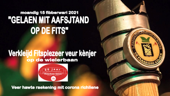 Op maandagavond 15 februari organiseren carnavalsvereniging De Flaarisse uit Geleen en Stichting Wielerbaan Geleen “Gelaen mit Aafsjtand op de Fits” voor kinderen vanaf 6 t/m 11 jaar op de wielerbaan bij Glanerbrook. Flaarisse: “Vanwege de coronacrisis zijn alle optochten en festiviteiten afgelast en daarom zijn we gaan brainstormen over eventuele alternatieven die binnen de huidige maatregelen vallen. We kwamen toen bij Michel van Dijke terecht die in oktober van het vorig jaar een meer dan geslaagd “Halloween Fiets Plezier”, een soort verklede fietsvaardigheidstraining heeft georganiseerd. Dit is precies wat we zochten voor carnavalsmaandag”. Kinderen komen verkleed op hun met lampjes versierde fiets naar een sfeervol verlichte wielerbaan. Best verklede jongen en meisje met mooiste uitgedoste fiets krijgt een trofee. Onderdelen tijdens deze ludieke fietstraining zijn parcours fietsen bestaande uit diverse obstakels, wipwap en Nónnevotte griepe. Hier grijpen kinderen al fietsend een nónnevot op stok. Verder is er een quiz over vastelaovend en aan het eind brengen alle kinderen de vastelaovend groet uit. Van Dijke: “Publiek is helaas niet toegestaan maar de jeugd kan zich in ieder geval verheugen op een sportieve en leuke belevenis". Aanvang: 18:30 uur / Einde 20:00 uur. Gratis voorinschrijven is verplicht. Dit kan tot 11 februari 2021.