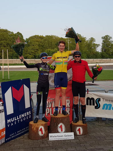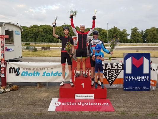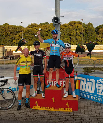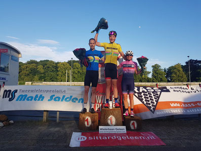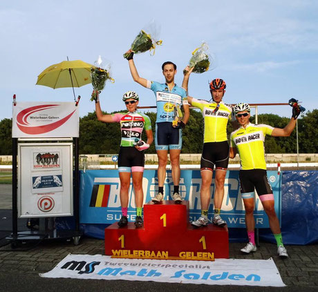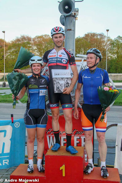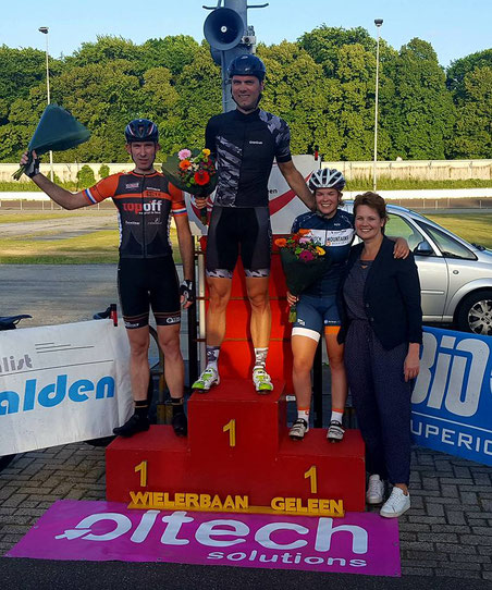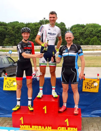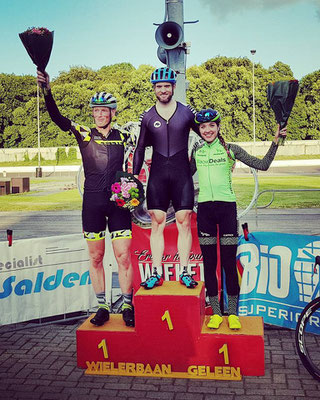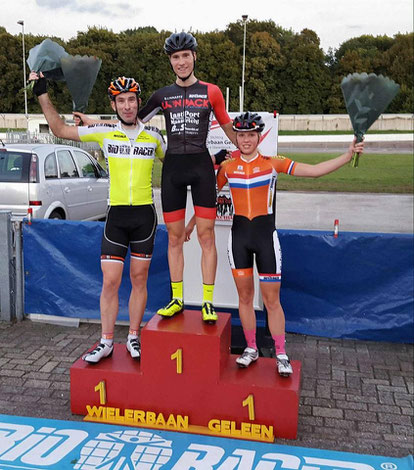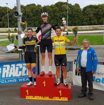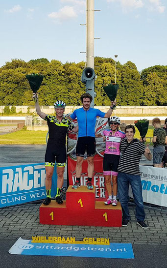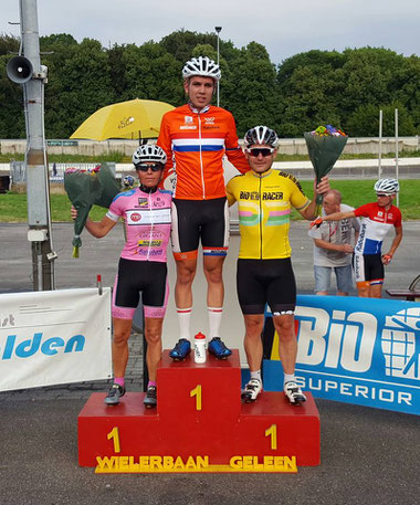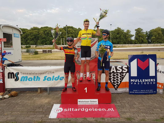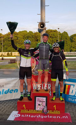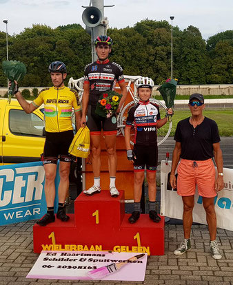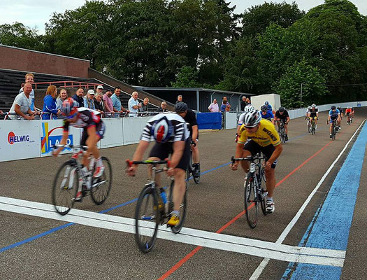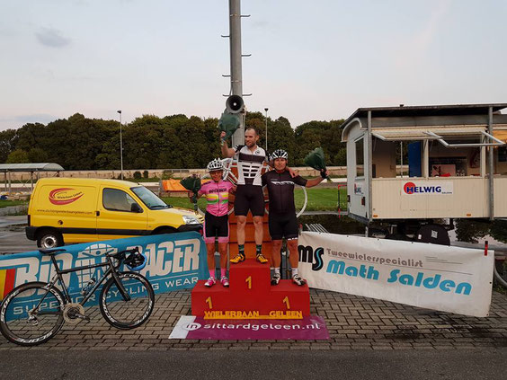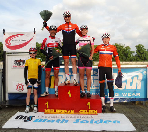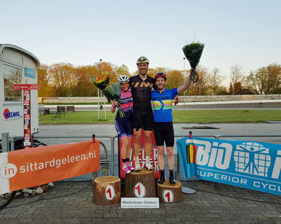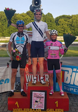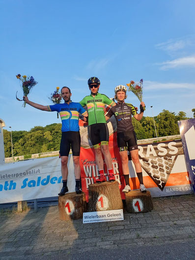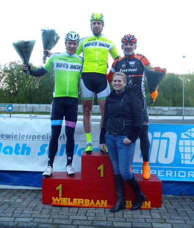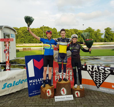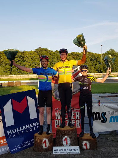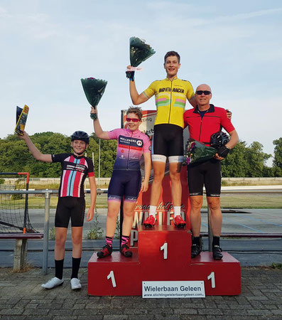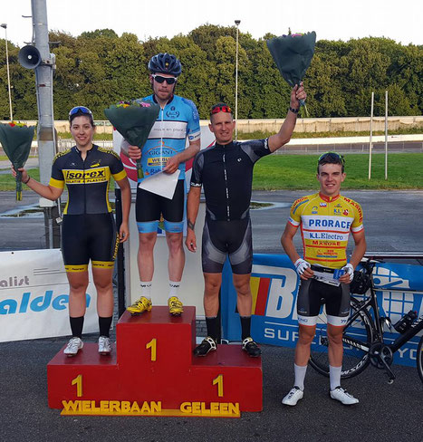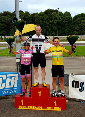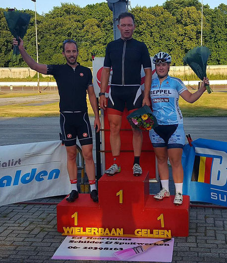 1. Jules Bremers (Brunssum) 3pnt, 2. Roel Jetten (Einighausen)2pnt, 3. Mark Steins (Linne) 1pnt. Meer foto's op https://www.facebook.com/groups/wielerbaangeleen/