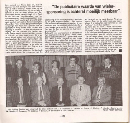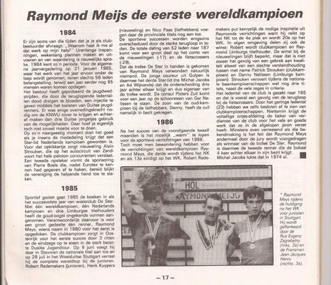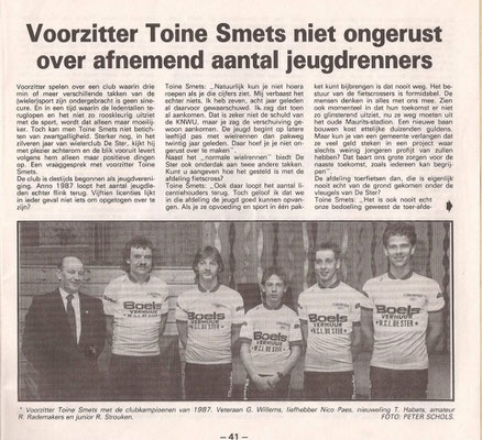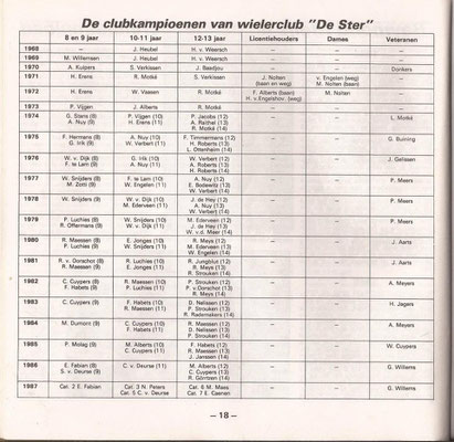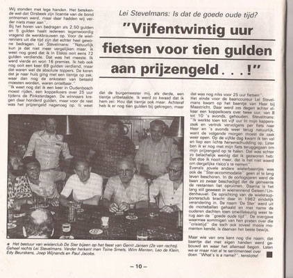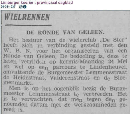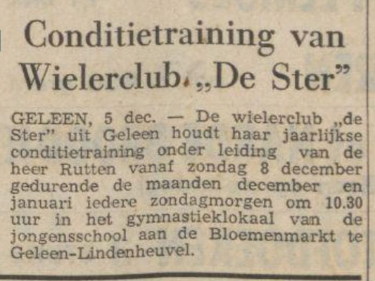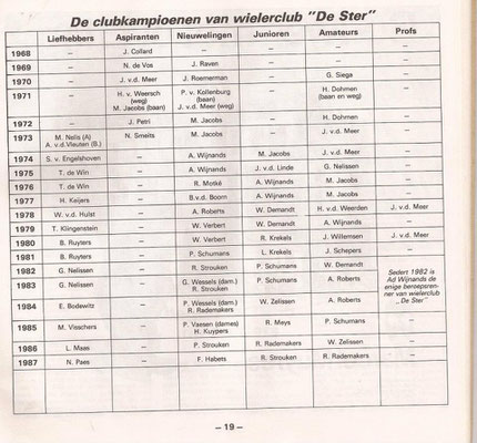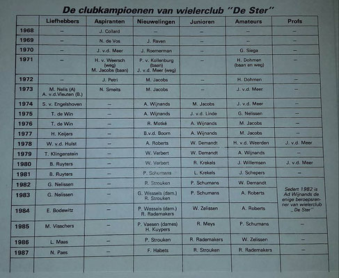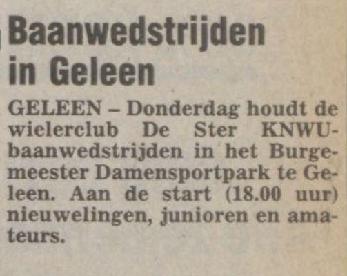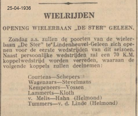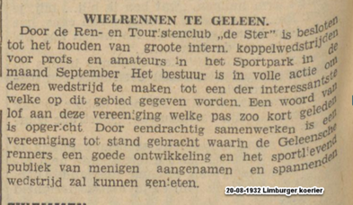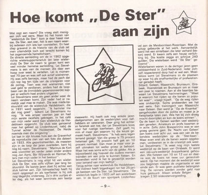 Lei Stevelmans weet als geen ander waar de naam De Ster vandaan komt. Zijn vader had er namelijk veel mee te maken. Die was mede- bestuurslid van wielervereniging Heidebloem, die in 1931 werd opgericht. Deze wielerclub legde zelf een wielerbaan aan. In de buurt van sportpark Lindenheuvel aan de meidoornlaan -Rozenlaan. Met de schop gebeurde al het werk. Aanvankelijk werd het een sintelbaan die later verhard (beton) werd. Er kwam zelfs een heuse verlichting bij. Die kostte zegge en schrijven 240 gulden. De wielerbaan werd "De Ster" genoemd. Op 28 november 1962 werd Wielerclub De Ster opgericht die eigenlijk is ontstaan vanuit supportersclub De Ster die renners als Gerrit Scholten, Hans Heezen, Henk Hoogeveen, Ben Knarren e.a. ondersteunde . Renners als Ad Wijnands, Raymond Meijs, Danny Nelissen, Patrick Strouken, Jos Alberts, Michel Jacobs en Piet van Kollenburg waren ook lid van De Ster. In 1992 werd De Ster ontbonden.